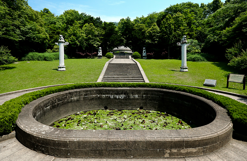 墓前有一座精雕的汉白玉祭台,原是北京圆明园的文物,相传是法国进贡的。墓的东西两侧,各有一座方亭,供谒陵者休息。
