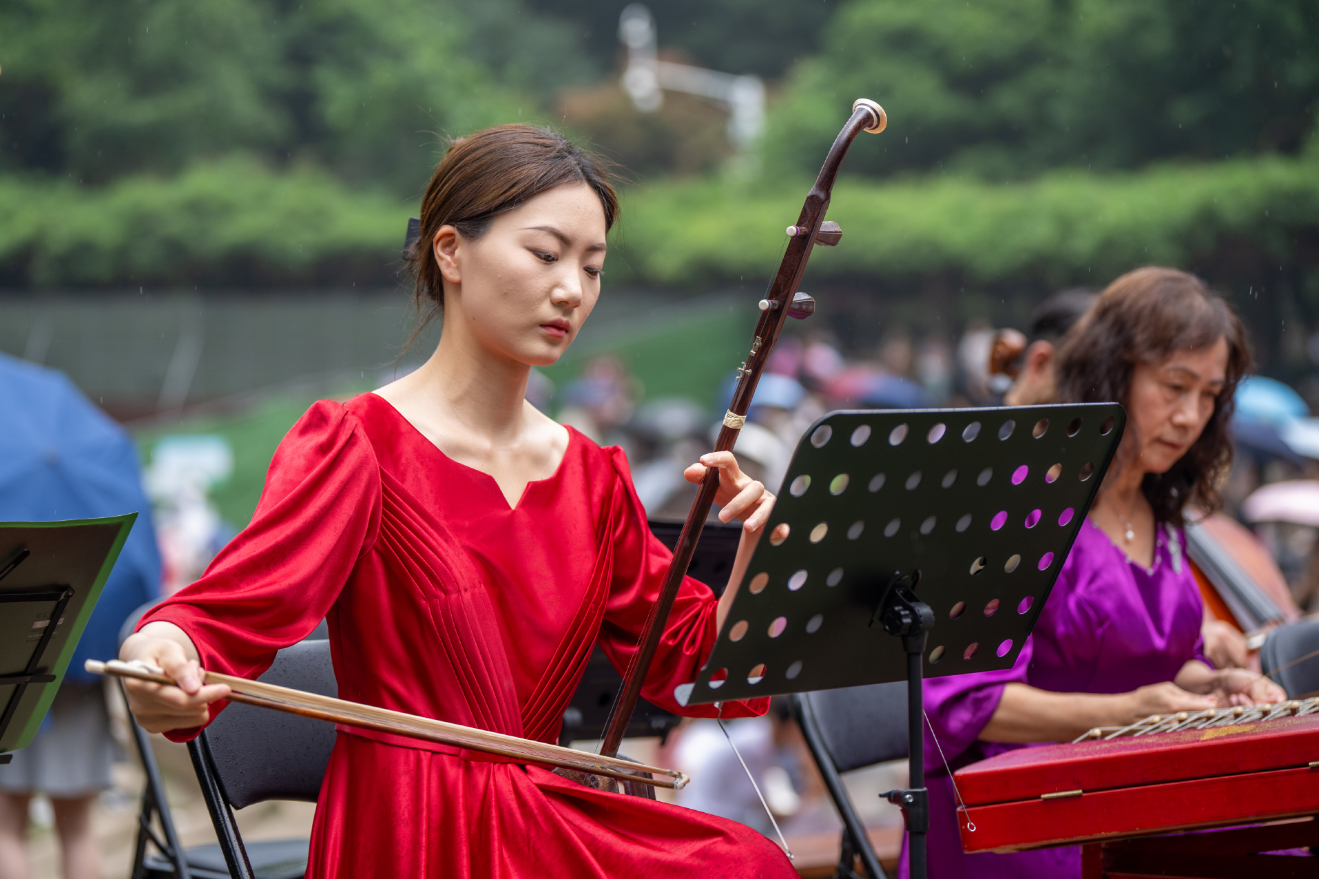 演奏员们精神饱满、兴致昂扬,指尖流淌出一首首经典民族乐曲。音乐台内琴声悠扬、余音绕梁,引来游客纷纷驻足观演,民族音乐的独特魅力在钟山进一步放大传承。