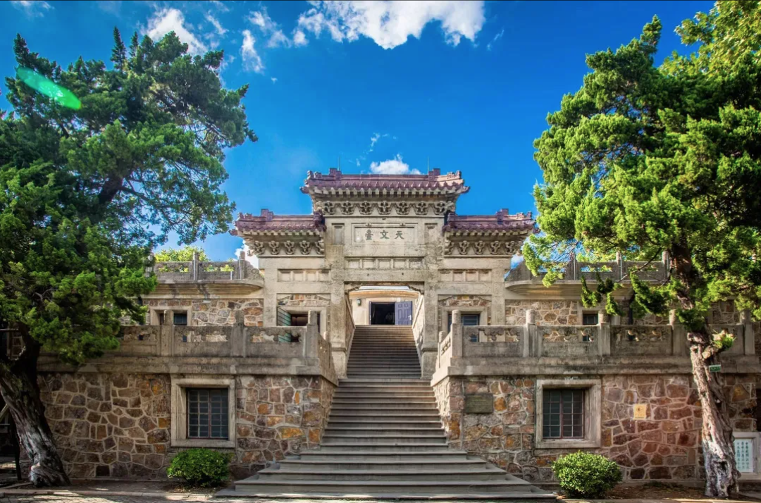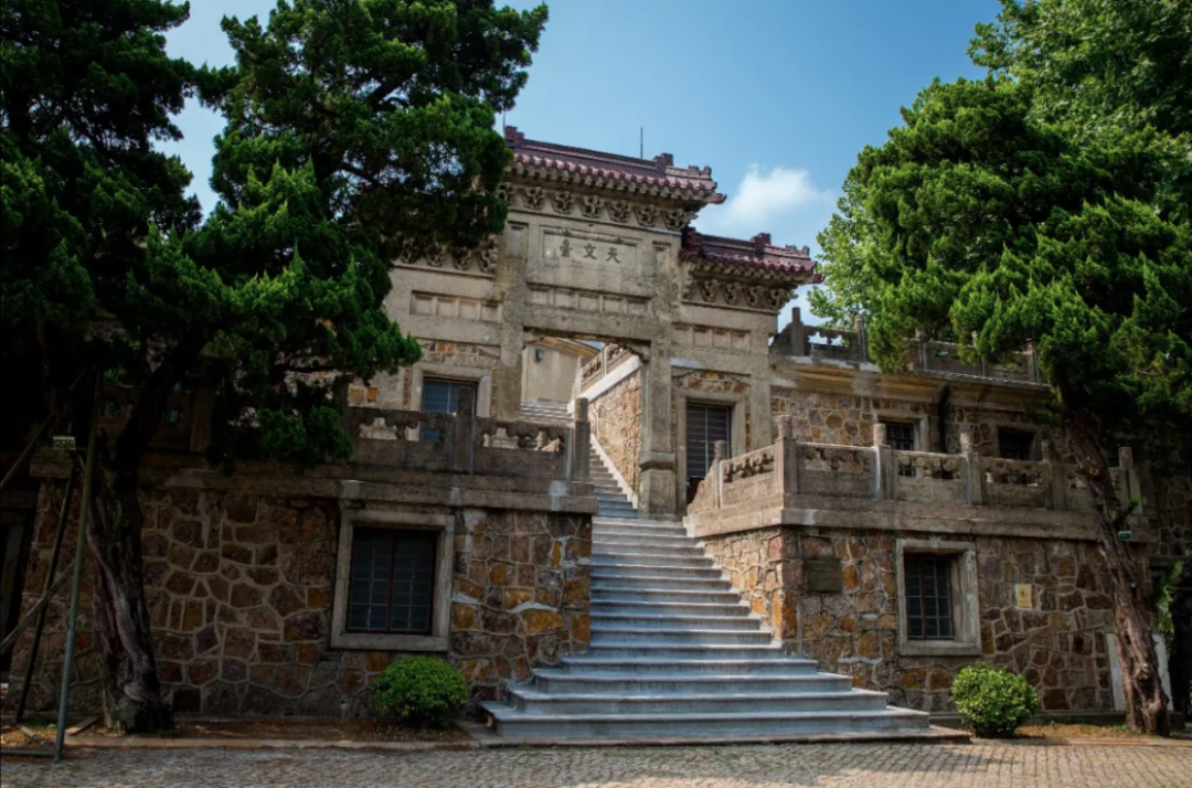 天文台标志性的办公主楼,采用中式牌楼形制,门头横额镌刻着“天文台”三个大字。整座建筑以虎皮石砌就基座与外墙,四周环绕石栏,远观既雄伟壮观,又尽显中式建筑之美韵。四座主要观测建筑——变星仪室、小赤道仪室、子午仪室和大台,其奠基碑落款时间别具深意的选在了“二分二至日”(春分、秋分、夏至、冬至),呼应着中国传统节气与天文节律。