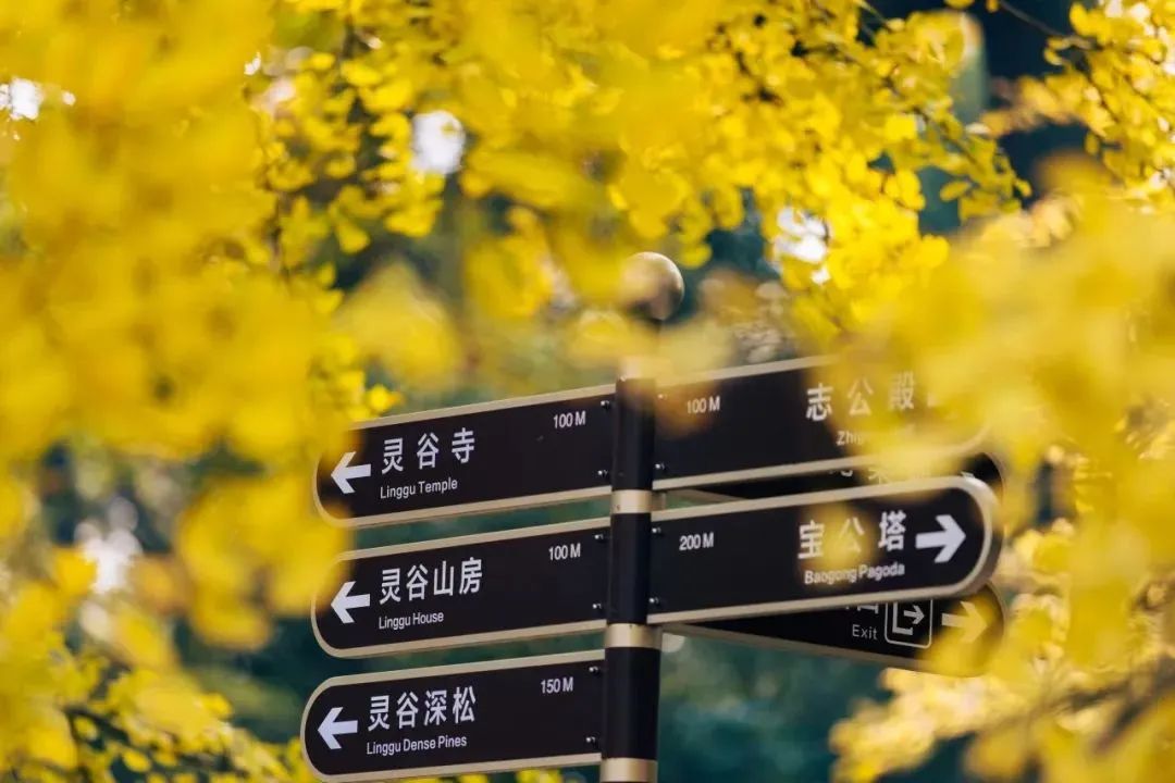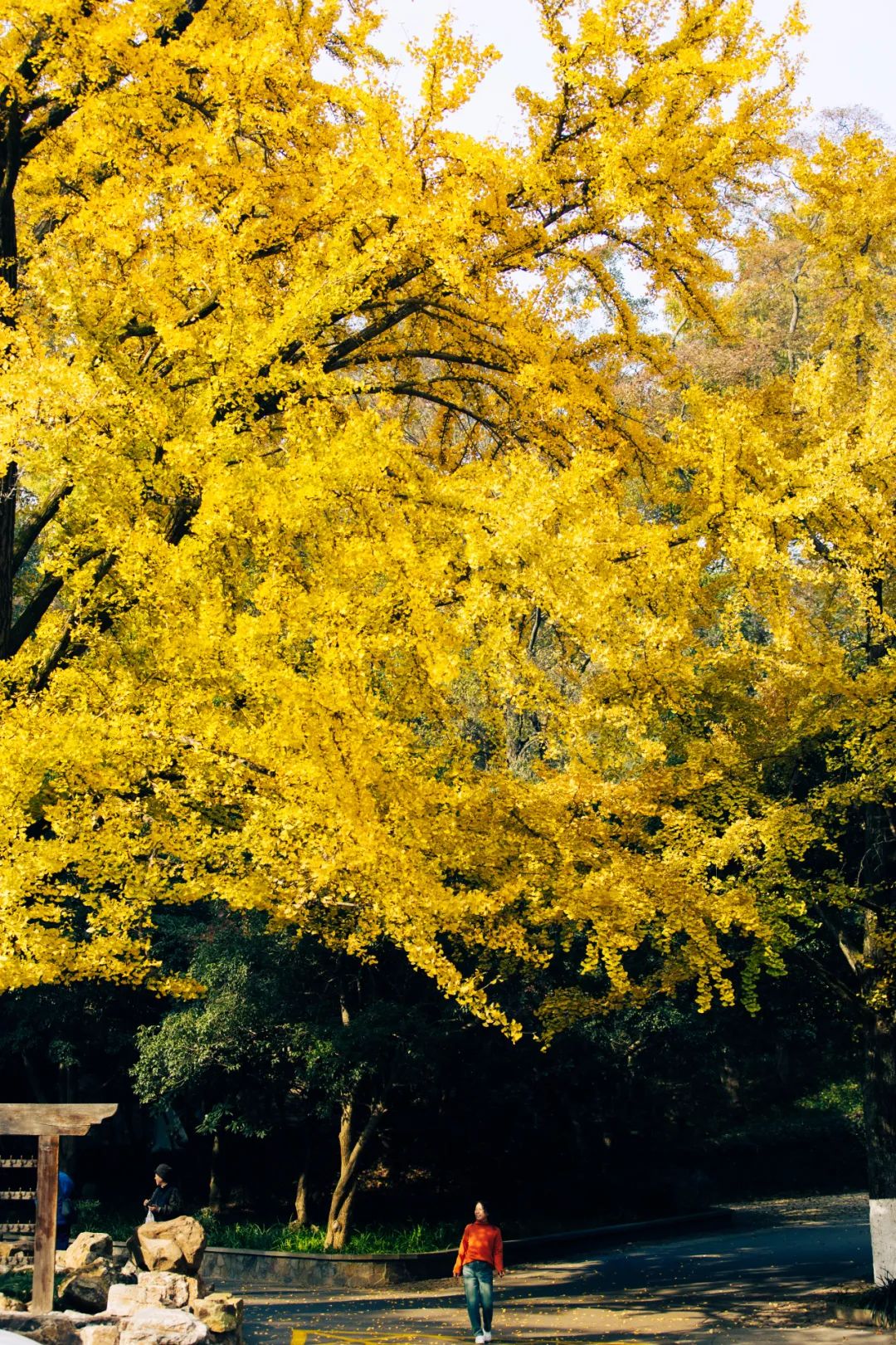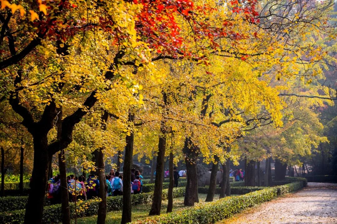 银杏是石象路“最美600米”秋色叶景观的骨干树种之一,每到秋季,金黄的银杏叶片与庄严肃穆的石象生相互映衬,碰撞出古老岁月里的时光通道,吸引着众多游客前来观赏和拍照留念。灵谷景区无梁殿周围的一株古银杏,已有690多年的树龄,是景区内树龄最大的古树名木,堪称“银杏王”,每到秋天,站在树下仰望,我们着实与古人同赏了一把同色之景。