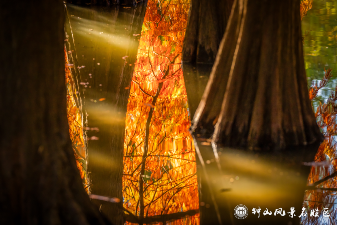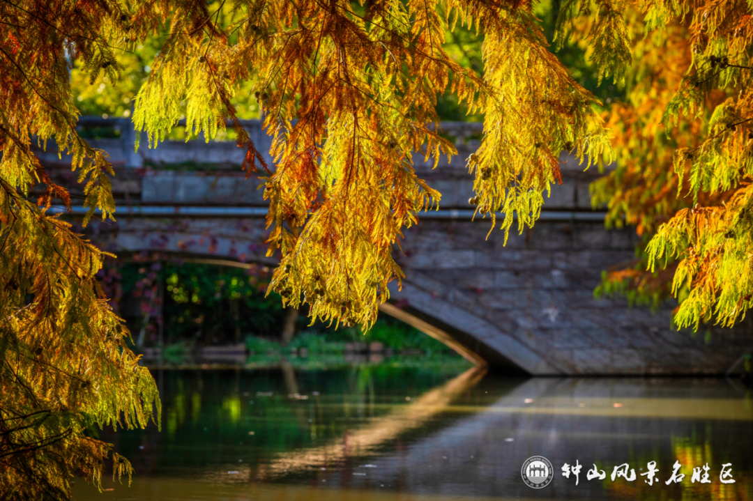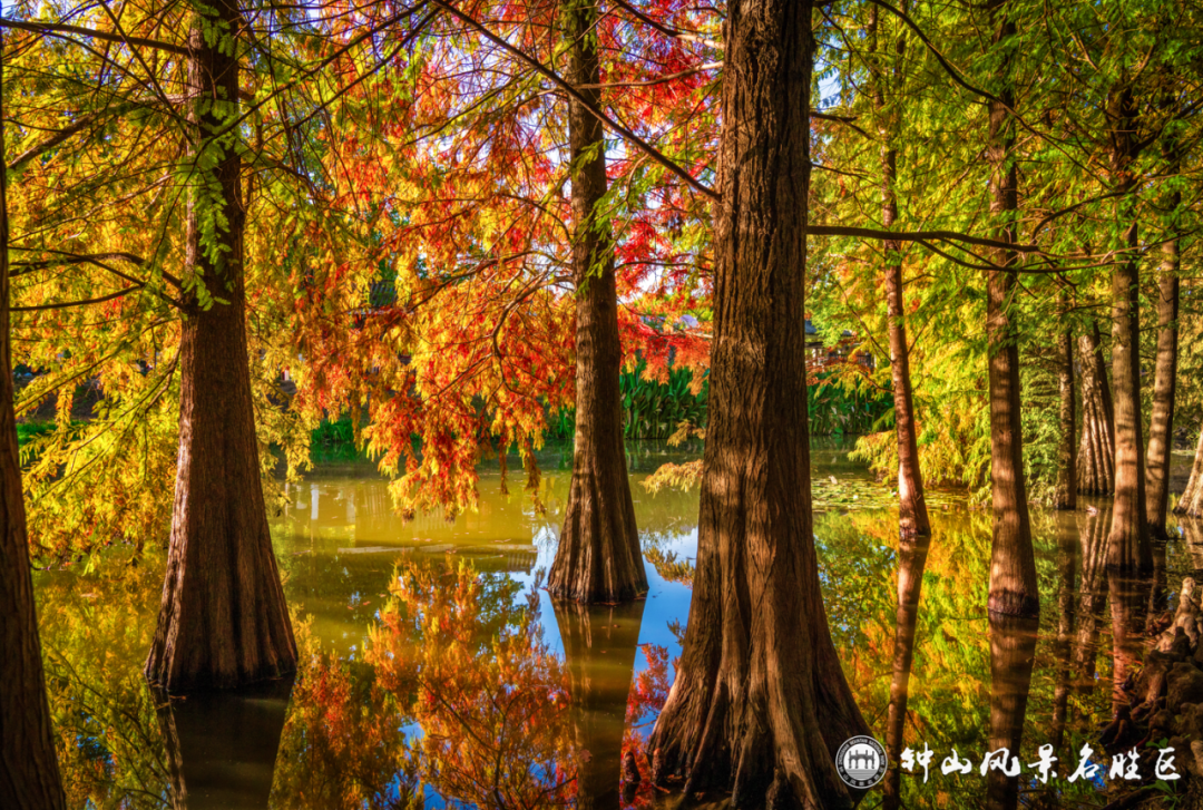 明孝陵三号门燕雀湖沿岸的水杉,夏季郁郁葱葱,秋季斑斓多彩,与落羽杉(Taxodium distichum )、池杉群植(Taxodium ascendens ),在周围燕雀湖、紫金山的映衬下,构成了一幅如诗如画的自然画卷。