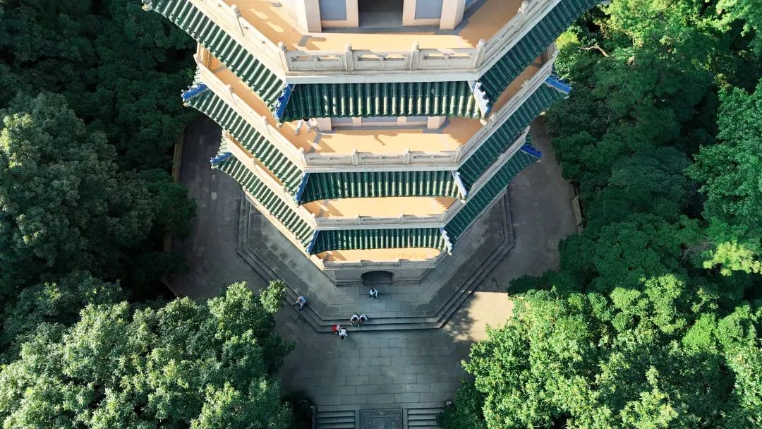 The Linggu Pagoda, built between 1931 and 1933 and jointly designed by American architect Henry K. Murphy and Chinese architect Dong Dayou, rises 60 meters high with nine octagonal stories. Made of reinforced concrete and Suzhou granite, it is both solid and graceful, with green-glazed eaves on each level. A spiral staircase of 252 steps leads to the top, where the full panorama of Zhongshan Mountain unfolds beneath you.
