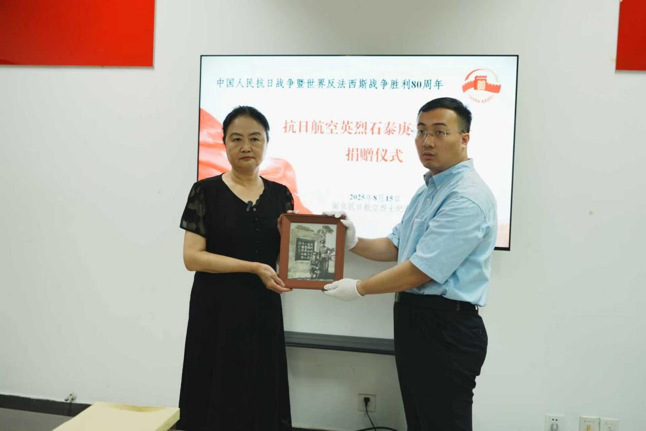 8月15日当天,南京抗日航空烈士纪念馆再获英烈亲属和热心市民捐赠重要抗日空战史料。其中抗日航空英烈石泰庚的后人捐赠石泰庚英烈在笕桥航校学习、受训期间的照片一张,上海市民沈鑫夫妇向抗馆捐赠1941年美国归侨飞行员马鸿安的信汇委托书和汇款副收条各一张。