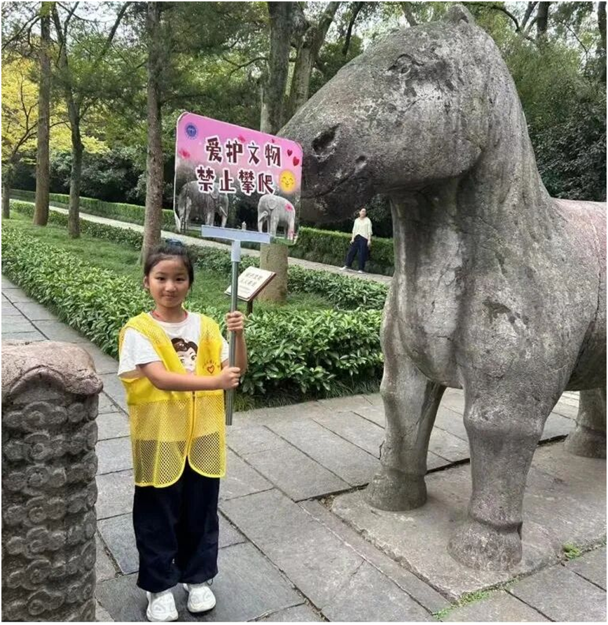文保队伍里还有些特别的存在——小小志愿者们。他们年纪不大,有的才上小学,却主动报名参与活动,认真负责的态度一点不输成年人。小小志愿者们有自己的 “传播妙招”:遇到同龄小朋友想攀爬石兽,他们会认真制止;游客问起简单的文保知识,他们还会拿出提前准备好的小知识点分享。这种儿童视角的传播格外有感染力,往往能让文保观念更轻松地走进大家心里。