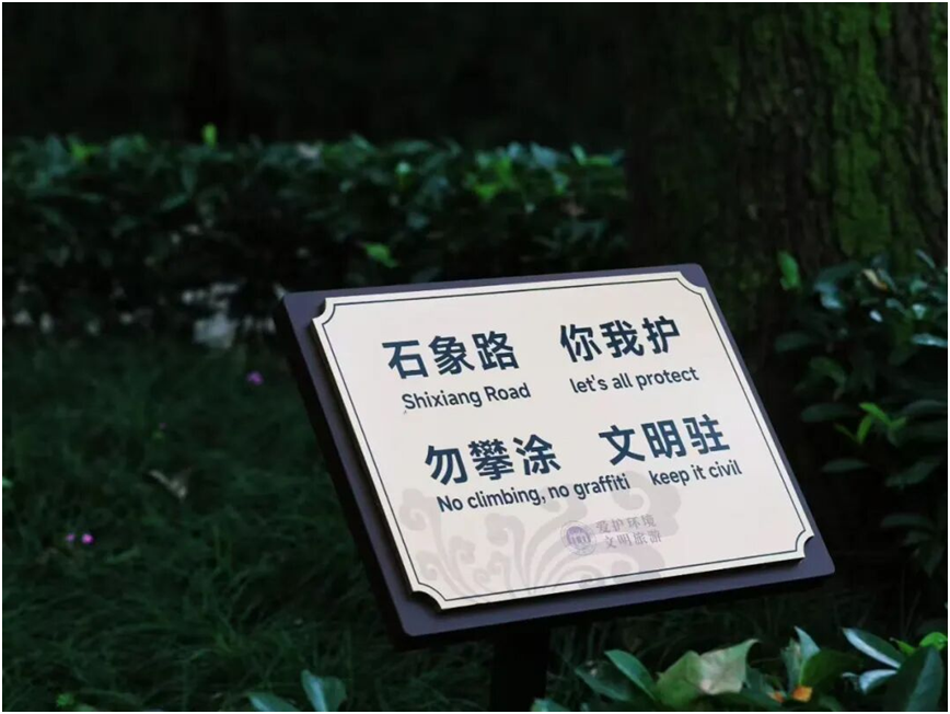 而这份跨越时光的守护,也离不开每一位访客的用心珍视 ——之前我们共同征集的守护标语,如今这份约定早已落地:每尊石刻身旁,都立着一句温情提示。
