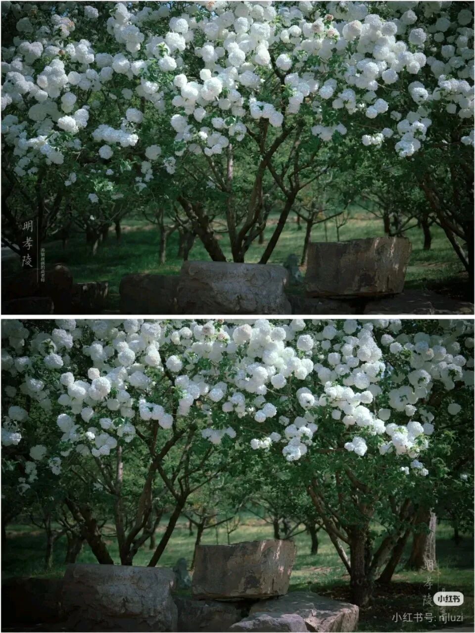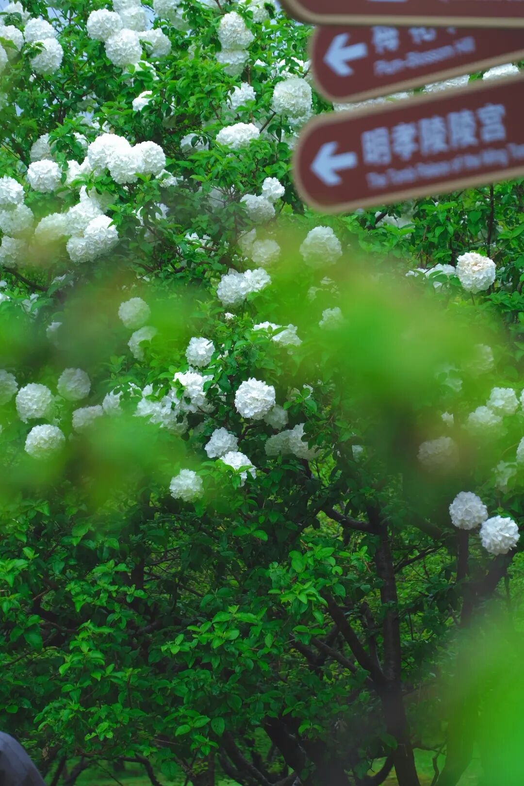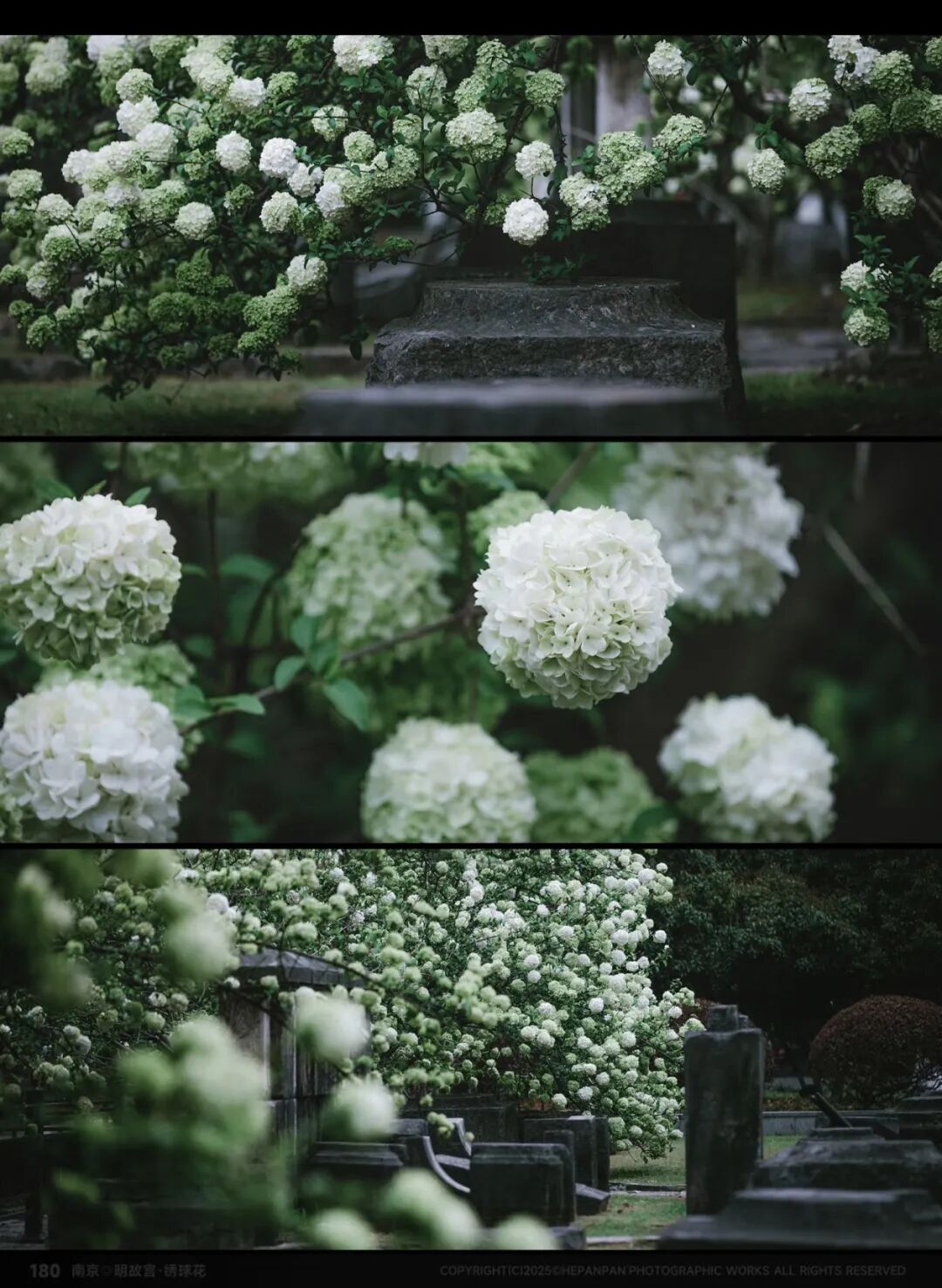 雪色花事,春日的明孝陵,纯白绣球是最惊艳的点缀。洁白花团为饰,苍柏古木相伴,即便是雨天拍摄,也是美得震撼人心。花团如汉白玉雕琢,瓣落似霜雪覆阶,风过花影轻扫石阶,像是与六百年的大明陵寝轻声对话。