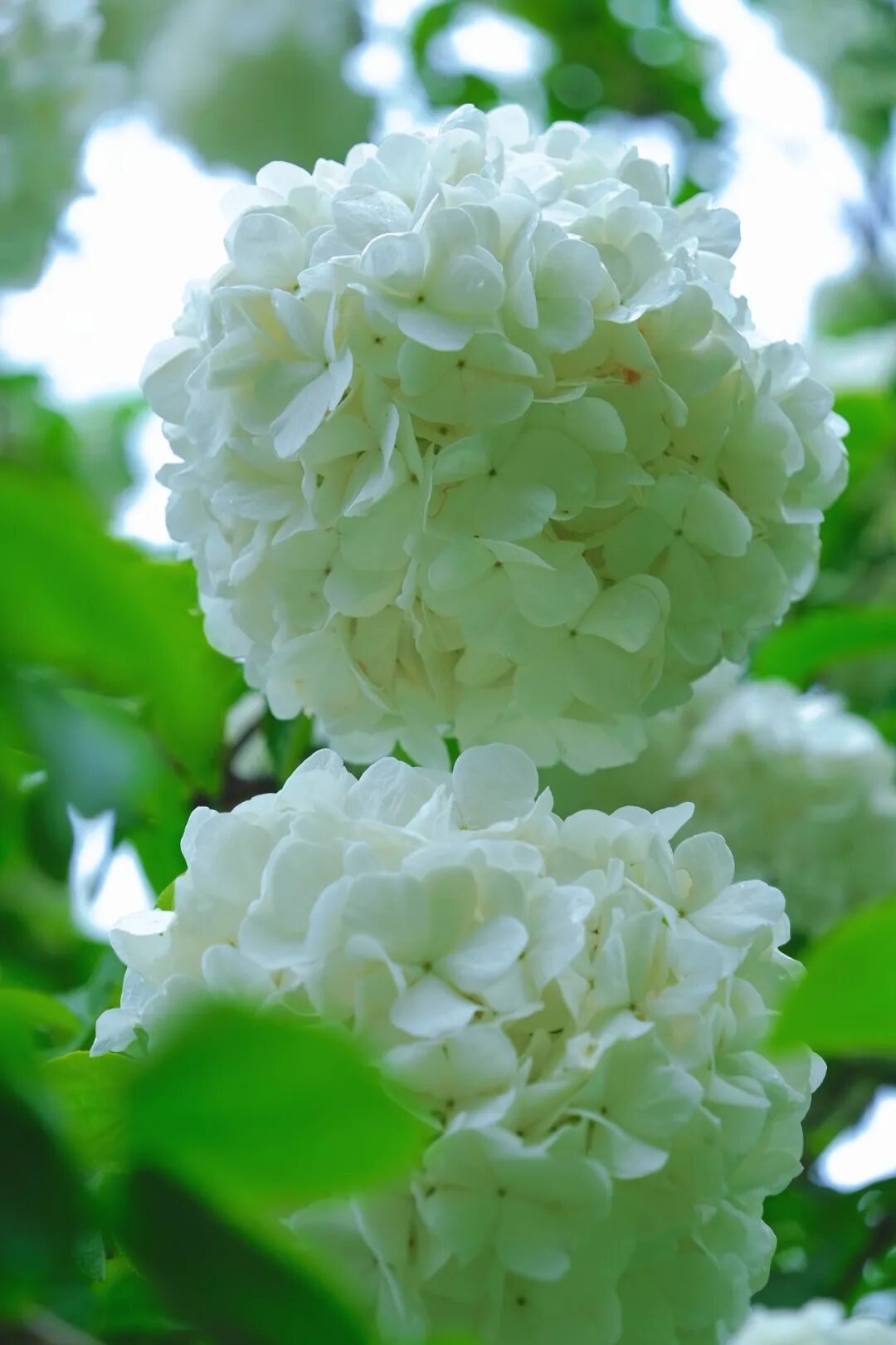 白的绿的花球挤在镜头里