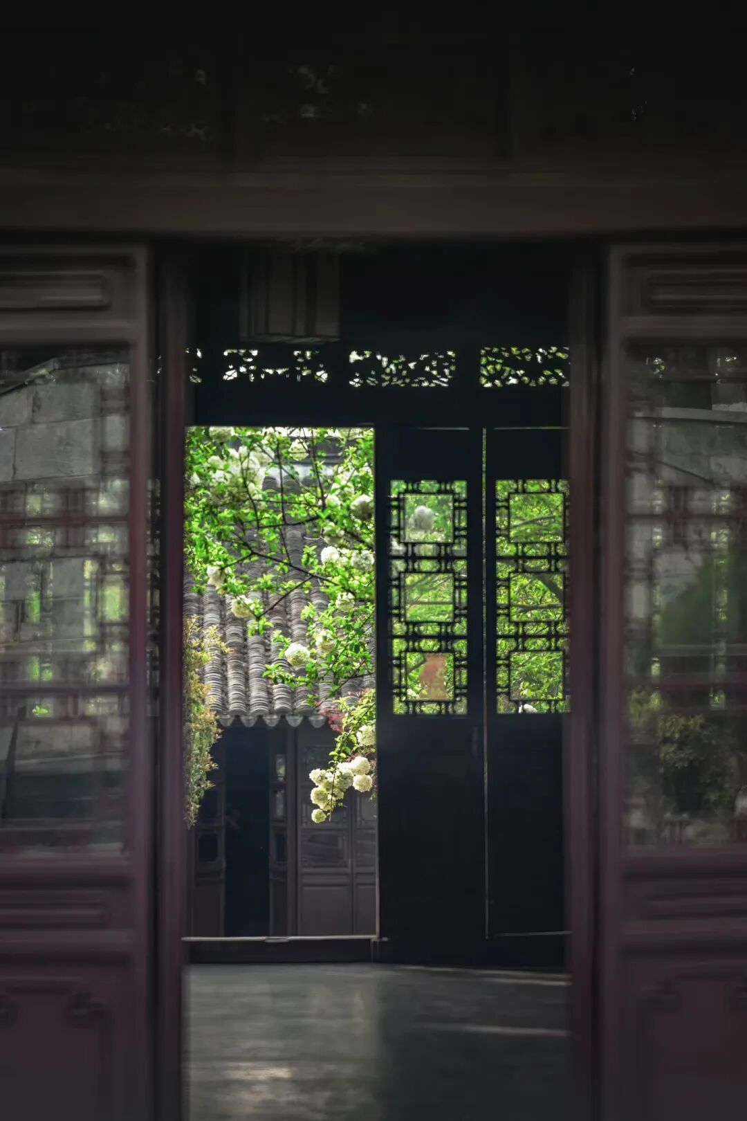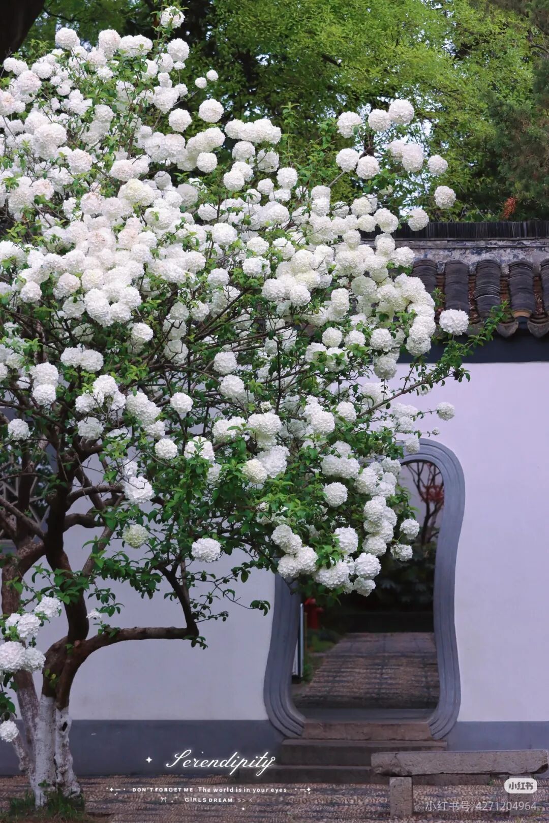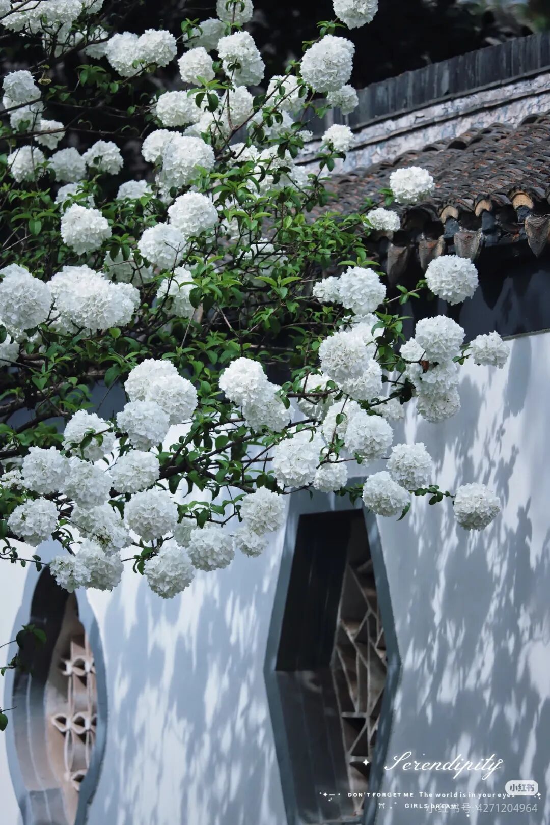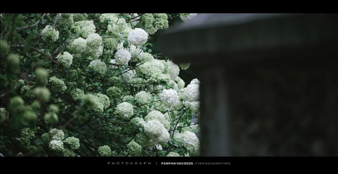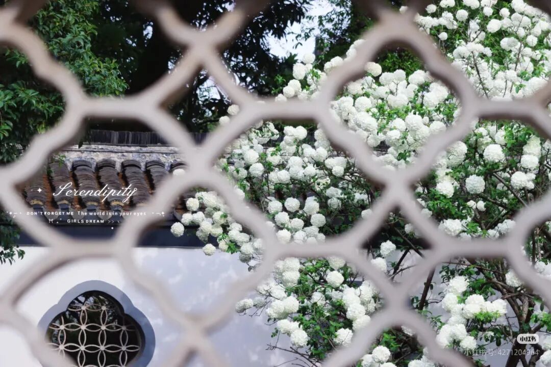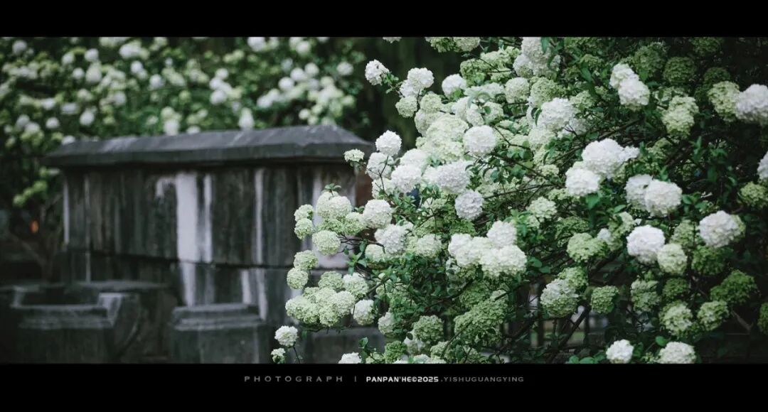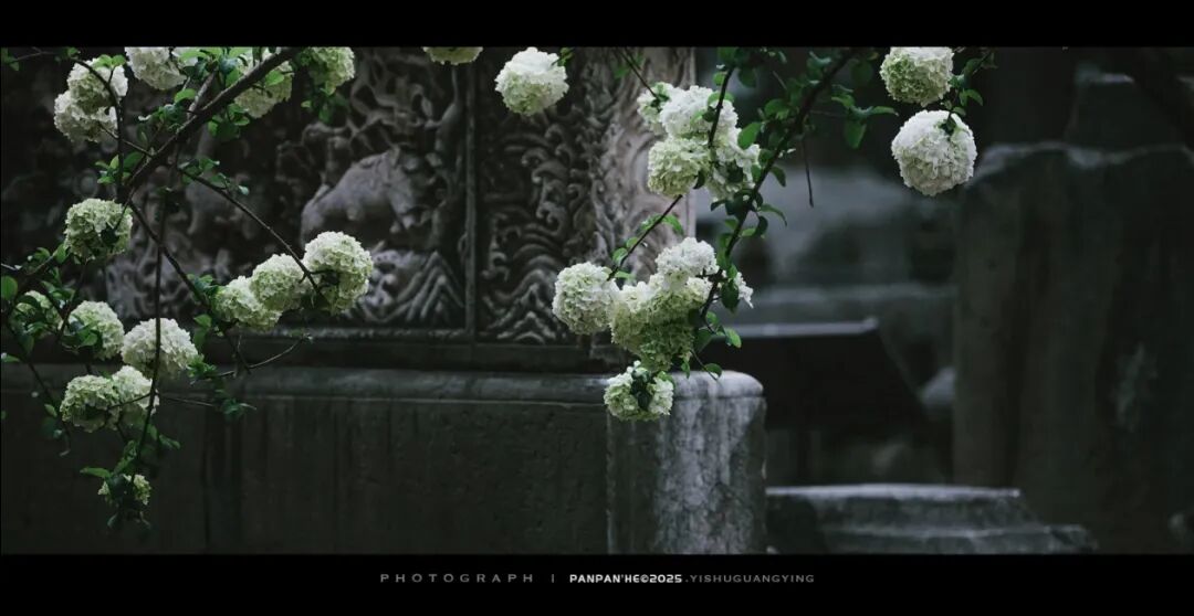 院内的纯白绣球,自带书卷气,与廊檐、黛瓦、古碑相映成趣。古树枝头缀满玉色花团,温润素雅,风过花摇,细碎花香与墨香交织。静坐廊下,看花影落在青砖石阶上,恍惚间似有明代书声穿越而来。这里的绣球,少了几分宫阙的庄严,多了几分文人的清逸,是明式风雅最直观的体现。