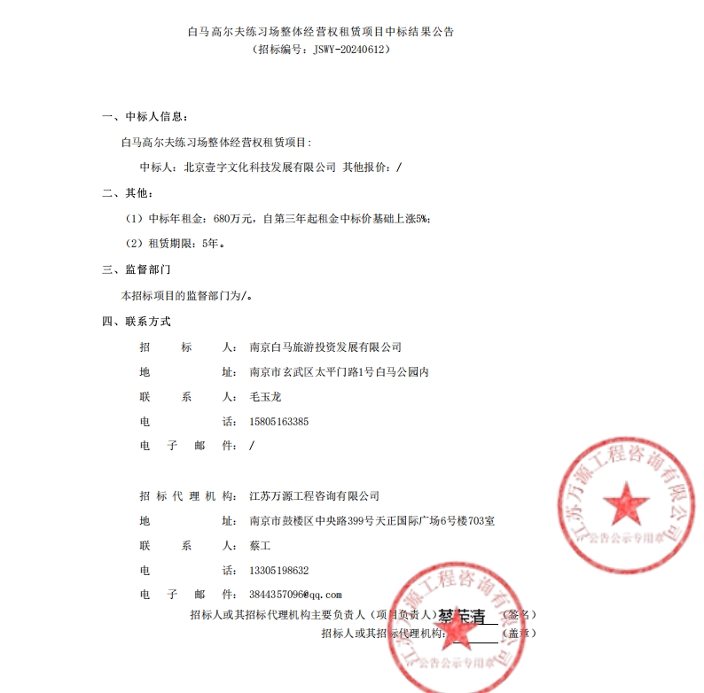 白马高尔夫练习场整体经营权租赁项目中标结果公告