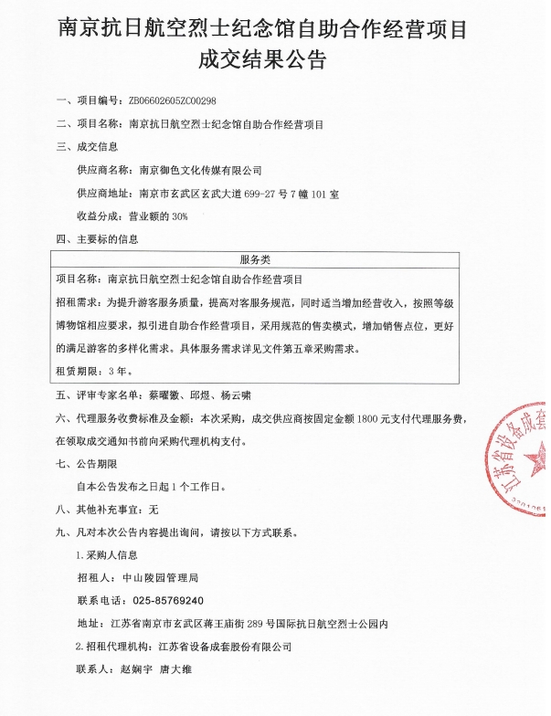 南京抗日航空烈士纪念馆自助合作经营项目成交结果公告