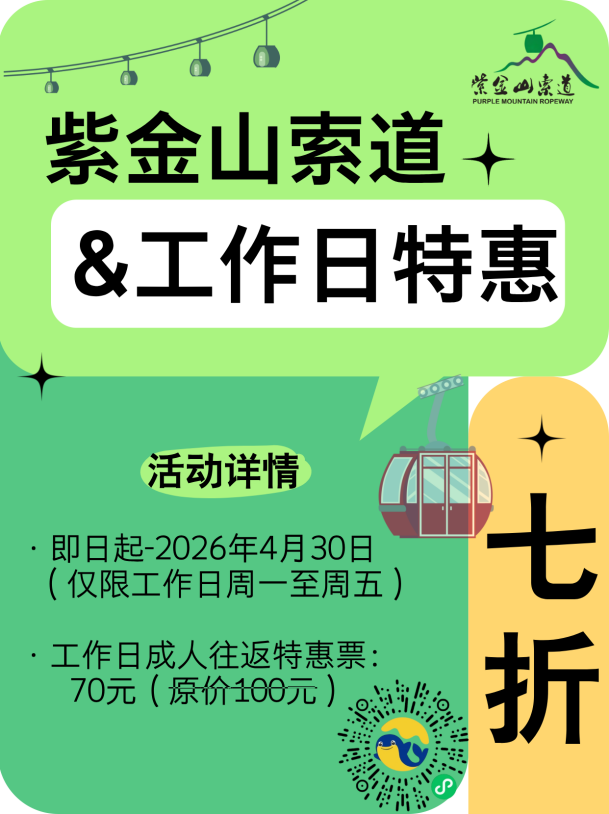 2026年4月30日前工作日,购紫金山索道往返票,享7折优惠。