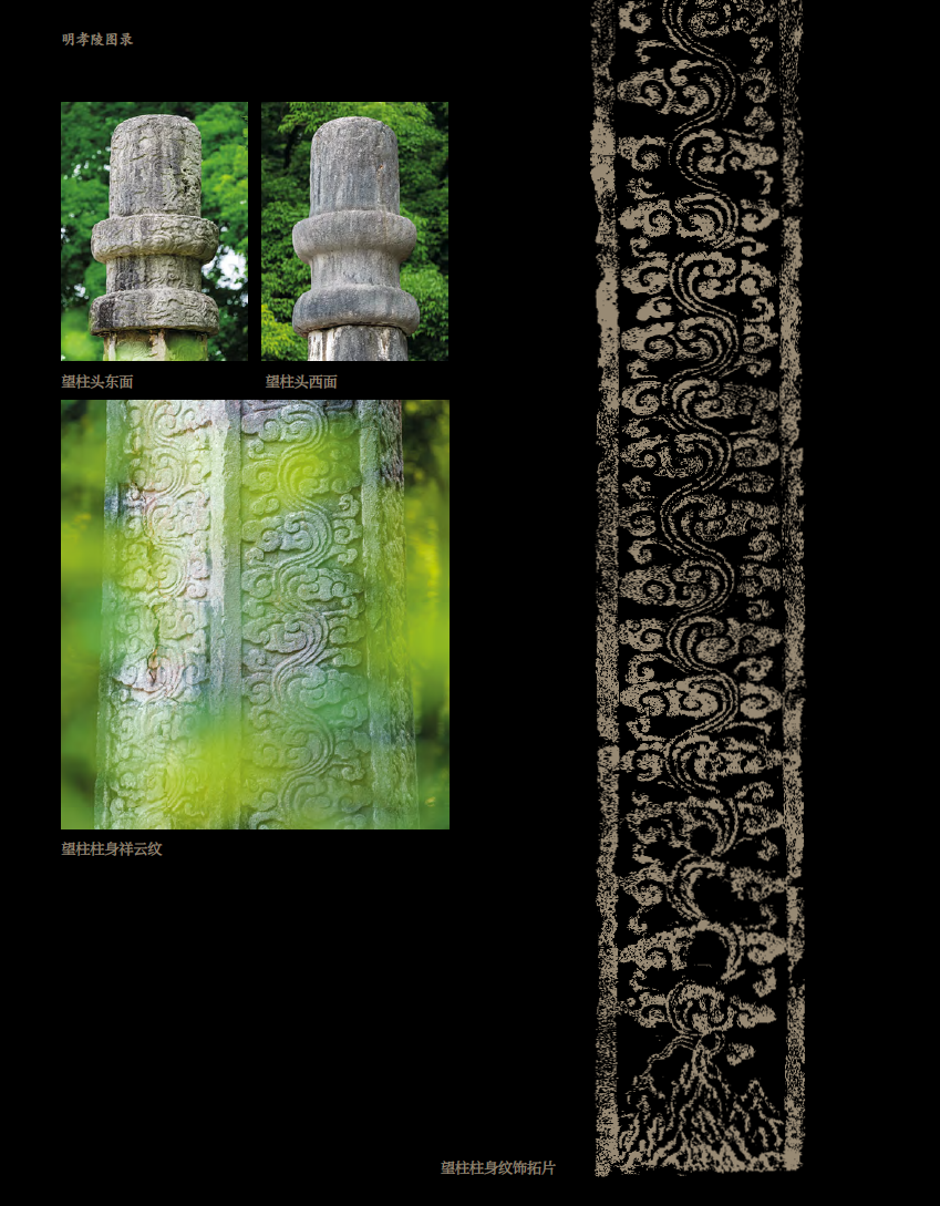 《明孝陵图录》对明孝陵建筑和石刻基本历史信息进行描述,注重专业术语和礼制用途考证,揭示其当时运用南京本土特色建造石材、因地制宜的建造技术,以及具有典型明初洪武特征的装饰题材和艺术风格。《明孝陵图录》中每一座单体建筑和单体石刻,均按照整体造型、局部细节、辅以拓片或测绘图补充的顺序进行表达,形成了逻辑完整严谨的图像叙事。其中,大量针对工艺、装饰的特写图片,对人们在参观过程中容易忽略的细节重点进行了展示,既是对建筑石刻细致观察的体现,也是很重要的历史原真档案和研究材料。