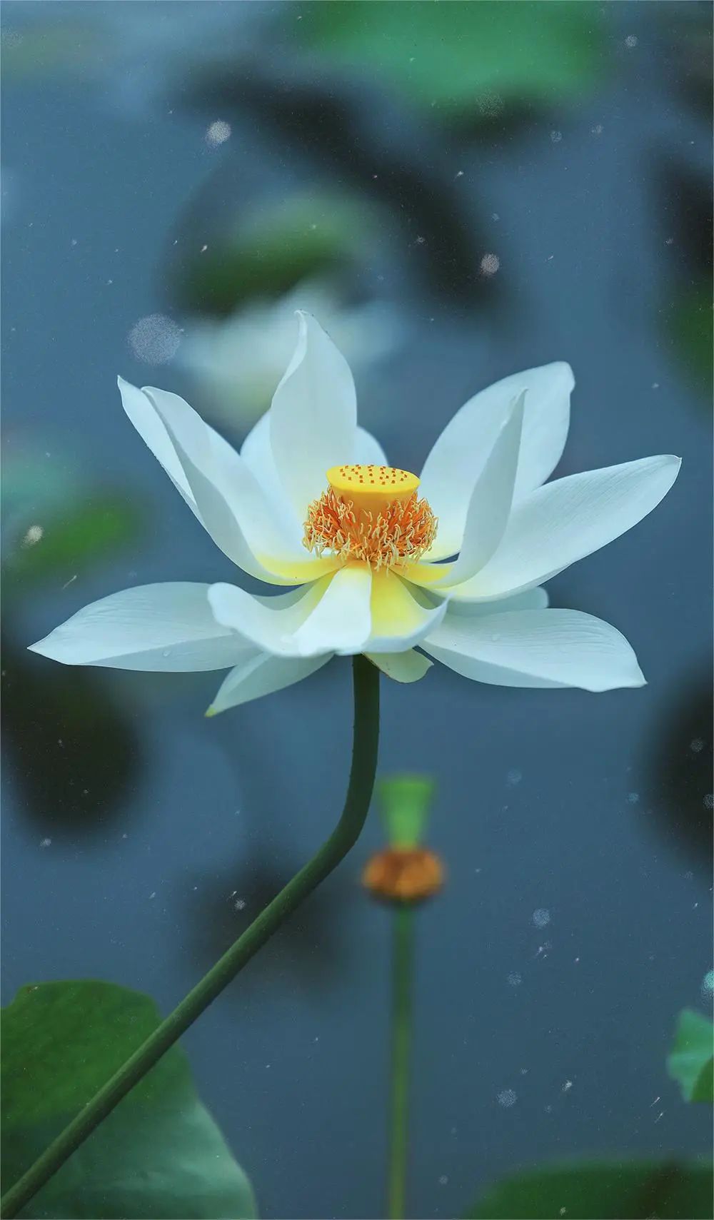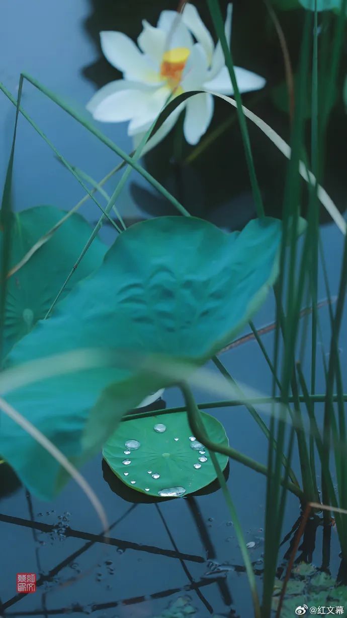 水面笼起轻烟似的水雾,荷花亭亭而立散发着幽香气息,叶片上滚落晶莹的水珠,湖水和雨水顺流而下,润泽了花朵,风景如画。