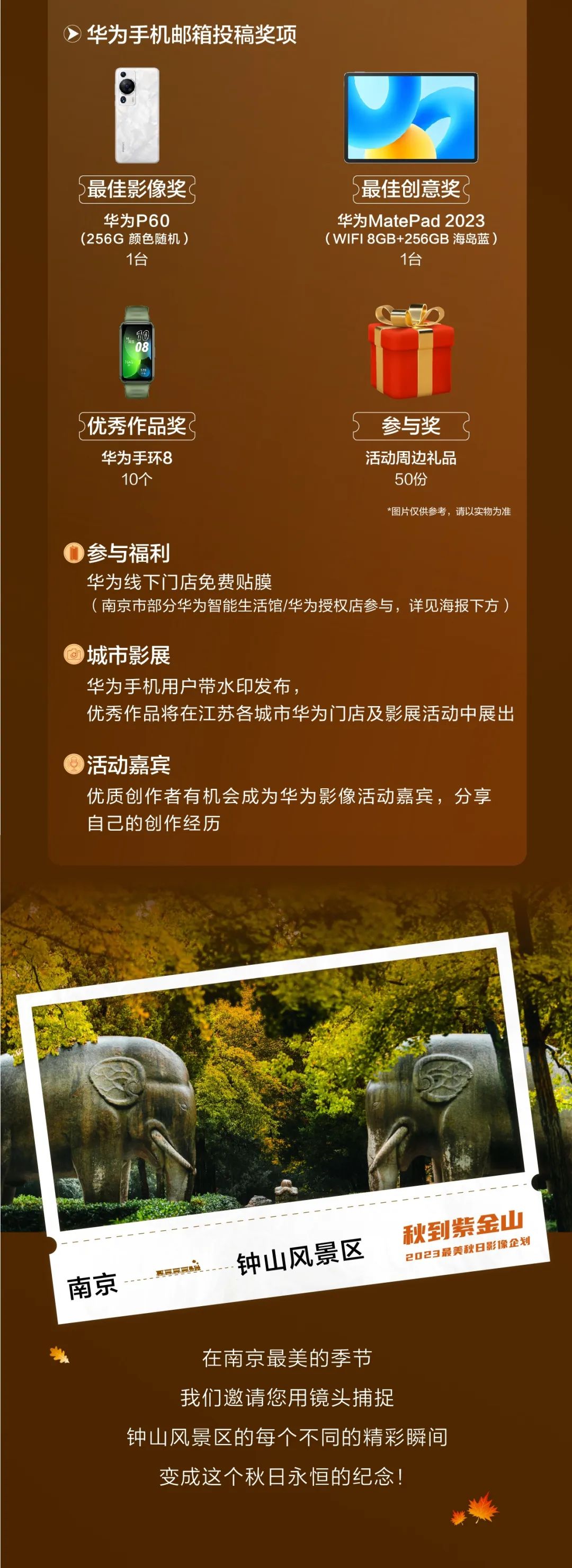 我们邀请你加入“秋到紫金山2023最美秋日影像”企划秀秋景赢新款手机、PAD、手表、耳机