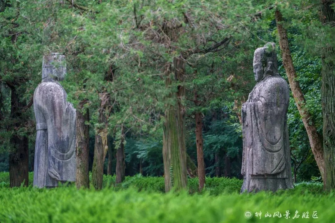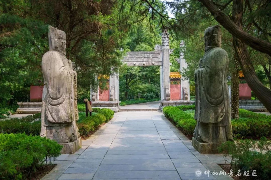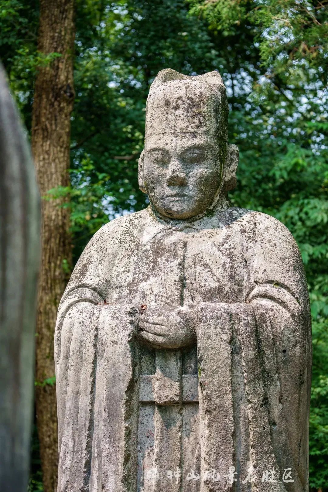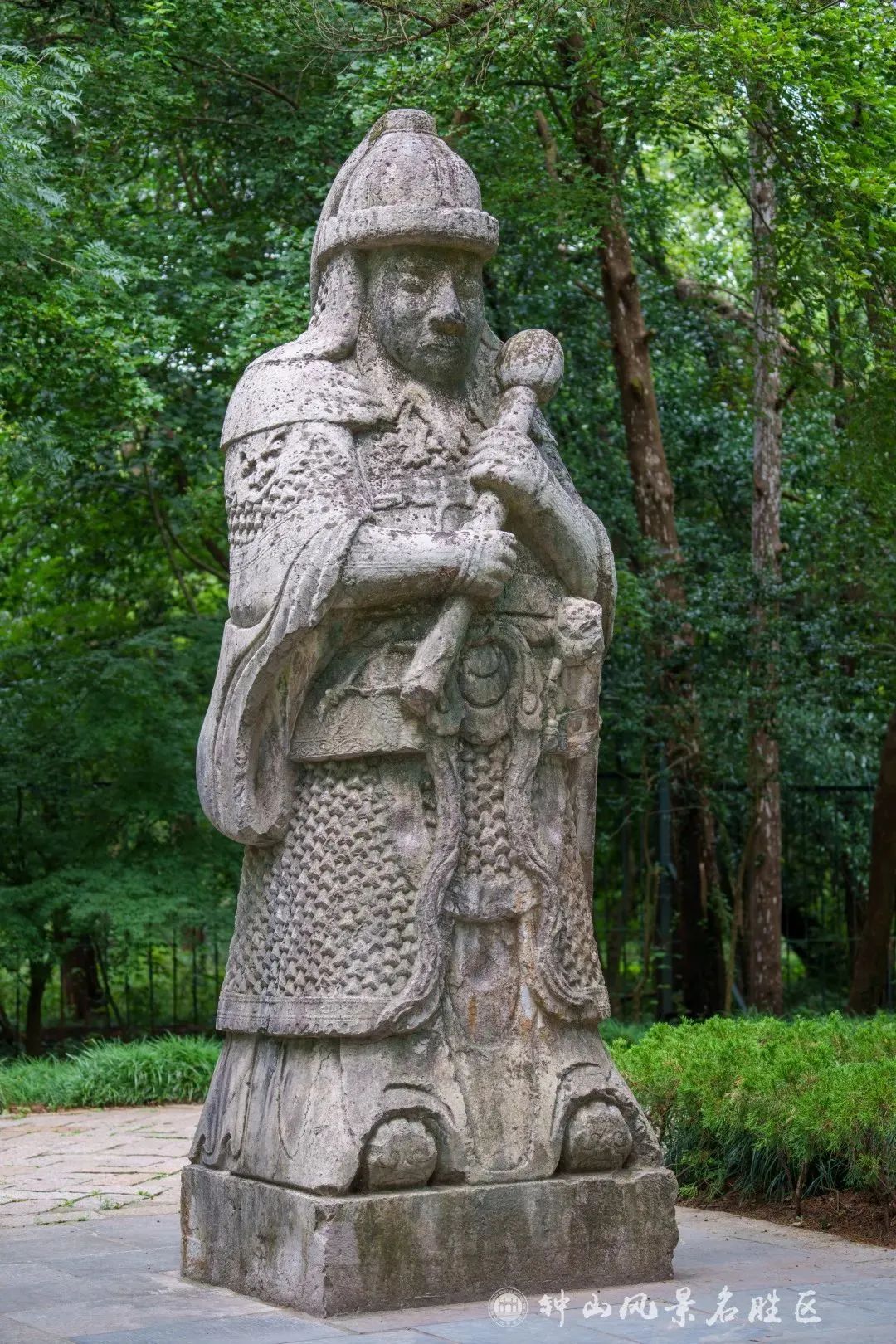 翁仲路是明孝陵的第二段神道,全长250米。两侧立有石刻武将两对、石刻文臣两对。石武将两对,一对面部无须,一对面部有须。每对武将相向而立,是陵墓的忠实守护者,《大明会典》称之为“带刀执爪盔甲将军”。石文臣两对,一对面部无须,一对面部有须。每对文臣相向而立,造型均为头戴朝冠,手秉朝笏,腰坠玉佩,足蹬云头靴,神情肃肃。