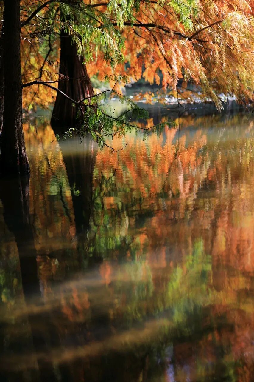 沿湖漫步,目光所及皆是惊喜。岸边垂向湖面的落羽杉已然褪去青涩,裹上蓬松的浅棕,在风中轻轻摇曳,与紫金山层林尽染的远景和谐相映。偶有天鹅划破湖面,激起层层涟漪,把倒映的天光云影搅成流动的色块,暖黄与湖绿碰撞出奇妙的化学反应,像极了印象派笔下的灵动笔触。