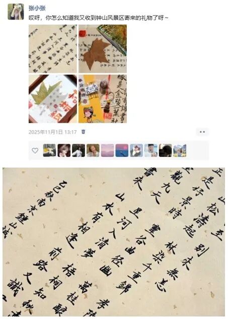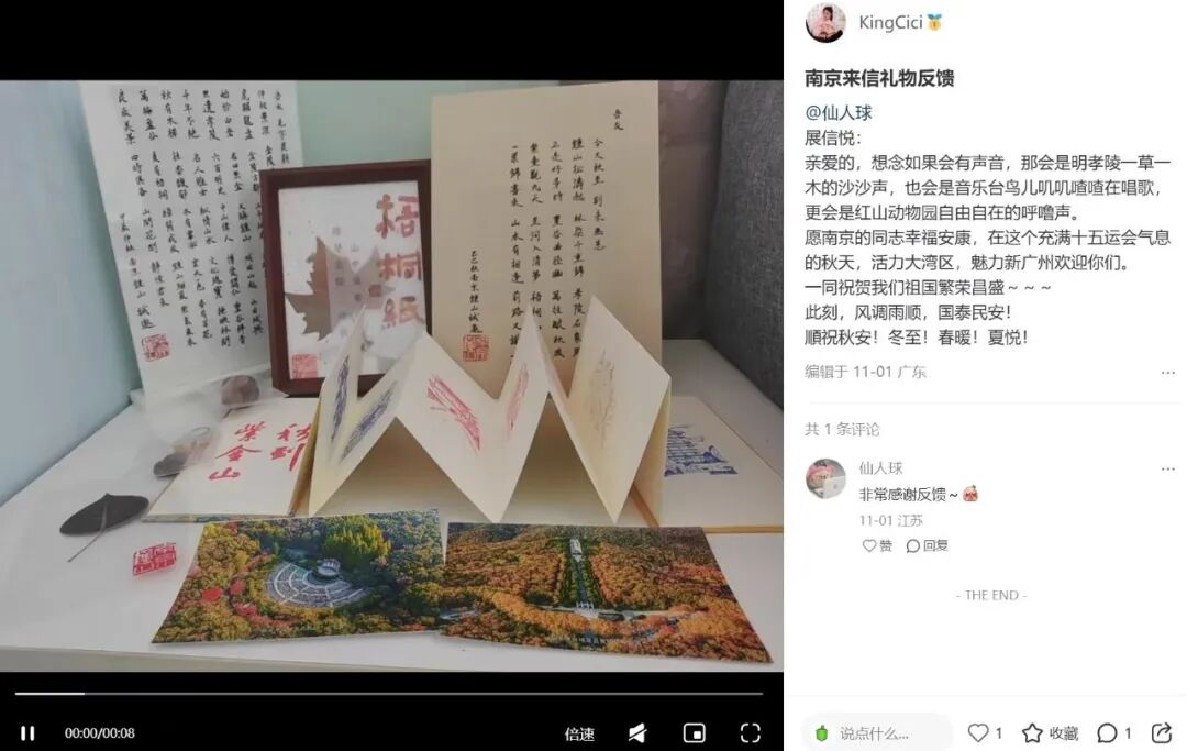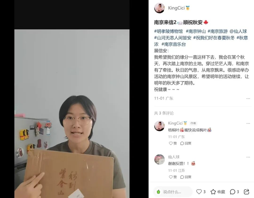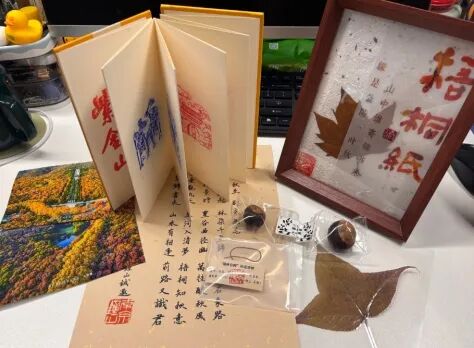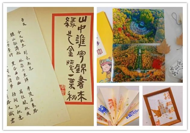 @钟山风景区,非常开心能够收到南京“钟山的秋”礼包,打开包裹一瞬间,就被震惊了,首先,第一感觉东西好多!随着一件件揭秘,可以用三个词来形容自己的感受:美好、精致、用心。几颗来自深秋的果实,让我深深体会到了四季的更替轮回,没有春生、夏长,又如何得到这累累硕果,自己也应该更努力一些了;梧桐纸装裱的相框也特别漂亮,纸张散发着古朴的气息,再加上一叶梧桐,更是增添了几分岁月的气息;还有来自明孝陵博物馆的盖章,图片很是精美!而先前去明孝陵参观时的经历,也深深地印在了我的心里,大明王朝还是太有魅力了!最后,当然要说的是最喜欢的书信啦,字好好看!对于特别钟爱中国传统文化的自己而言,感觉书信真的好有魅力!另外还有来自钟山风景区的秋叶、照片,都非常漂亮!上次独自一人登紫金山,中途起了小雨,到了山顶,云雾有些大,不太能看得清山下的景色,不过云雾缭绕也挺有意境的,等下次有机会了,再登一次紫金山。也有想过以书信的形式来回复,奈何觉得文采、文字都一般,故未敢下笔,望见谅!