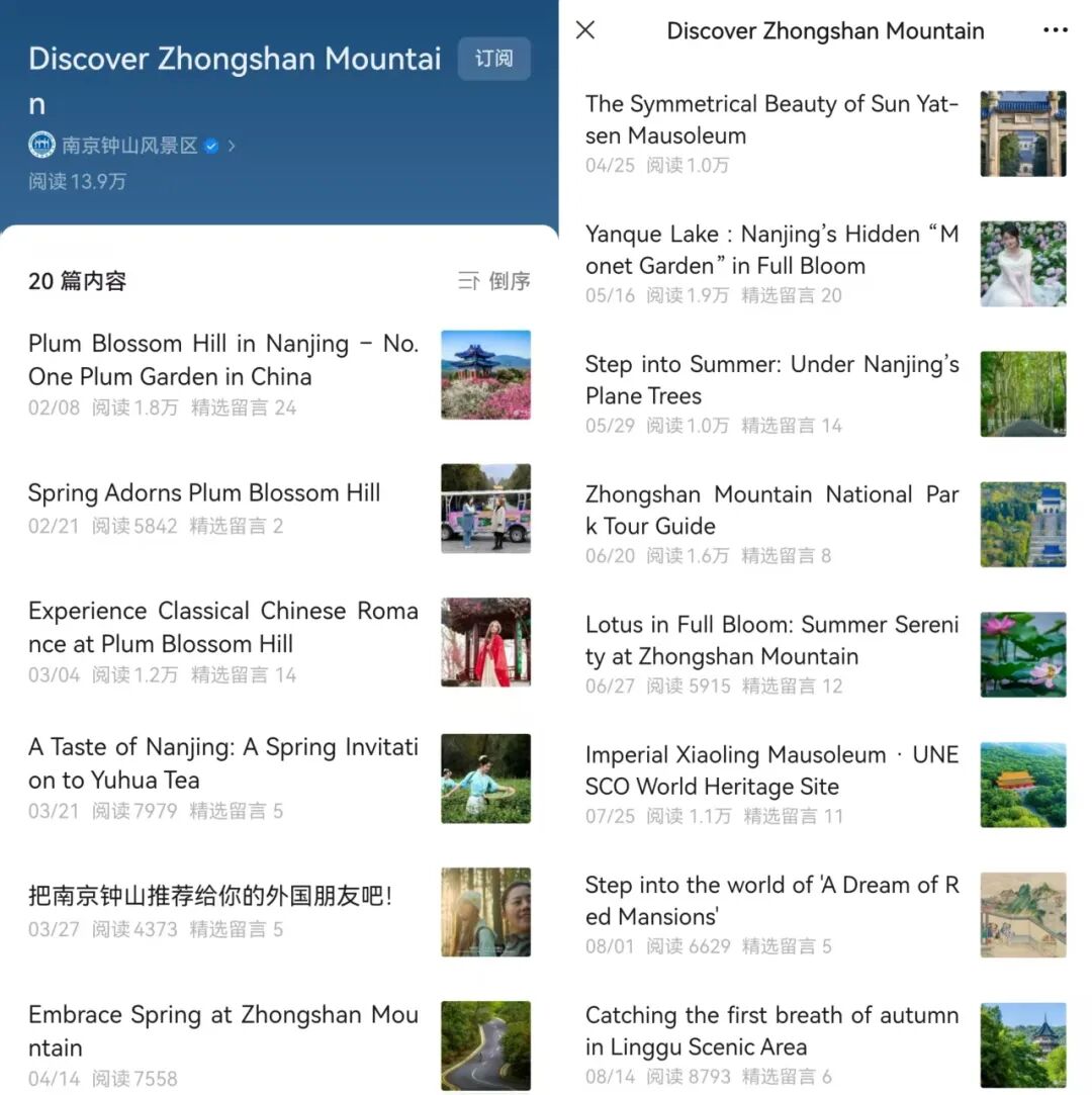 为做好钟山文化国际化传播,利用双语讲好钟山故事,让文化魅力跨越国界。2025年,官方微信策划推出#Discover Zhongshan Mountain专题宣传栏目,用双语介绍中国梅花、钟山雨花茶、紫金山天文台......等景区文旅景观及特色,全方位展示山水风光与人文内涵,让钟山的自然之美、文化之韵被更多国际友人知晓,推动文旅交流走向深度融合。