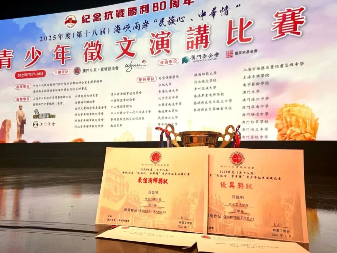 今年7月,第十八届海峡两岸“民族心·中华情”青少年征文演讲比赛总决赛在澳门举行,由孙中山纪念馆选拔、推荐,代表南京赛区参加决赛的两名大学生仇一曲和王雅宣均进入总决赛,分别斩获“最佳演绎奖”和 “优异奖”,为南京赛区再添荣光!