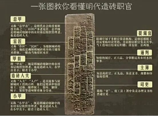 在这一制度下,每块城砖均需铭刻产地、各级督造官吏(如知府、知县、通判等)、基层负责人(总甲、甲首、小甲)以及窑户、工匠的姓名。