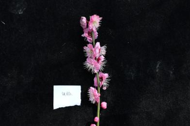 朱砂品种群。着花状况:中密,1~2朵疏生于中、短枝及束花枝上,个别于长花枝上;花期:2月上旬至3月上旬;花蕾:倒卵,扁圆,中心无孔,淡玫瑰紫红;花态:蝶型,花瓣3层,各层疏叠不整齐,内有碎瓣飞舞;花色:淡紫红色,反面较深;花心:有时台阁或台阁状。