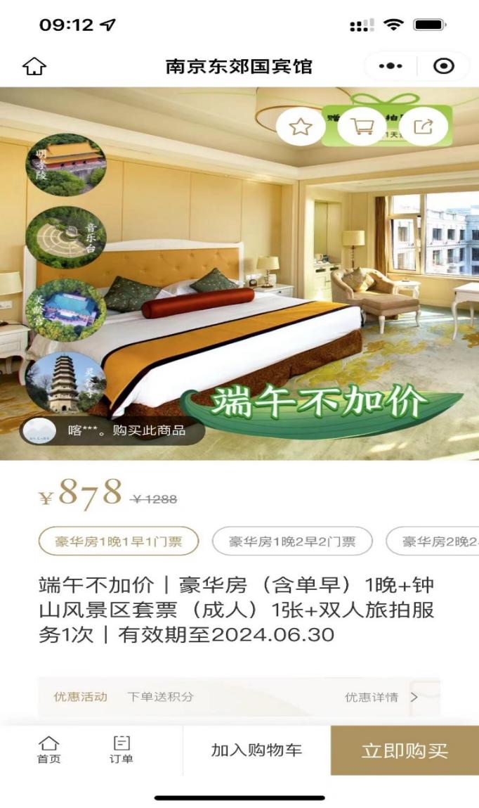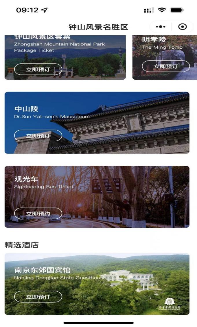 端午节前夕,“钟山风景名胜区”微信小程序新上线旅游套餐新产品,包含景区“明孝陵+音乐台+美龄宫+灵谷景区”成人套票1张、南京东郊国宾馆豪华房1间、双人旅拍服务1次,为游客带来全新的旅游服务体验。游客在“钟山风景名胜区”小程序页面“精选酒店”功能,即可购买体验该旅游产品。