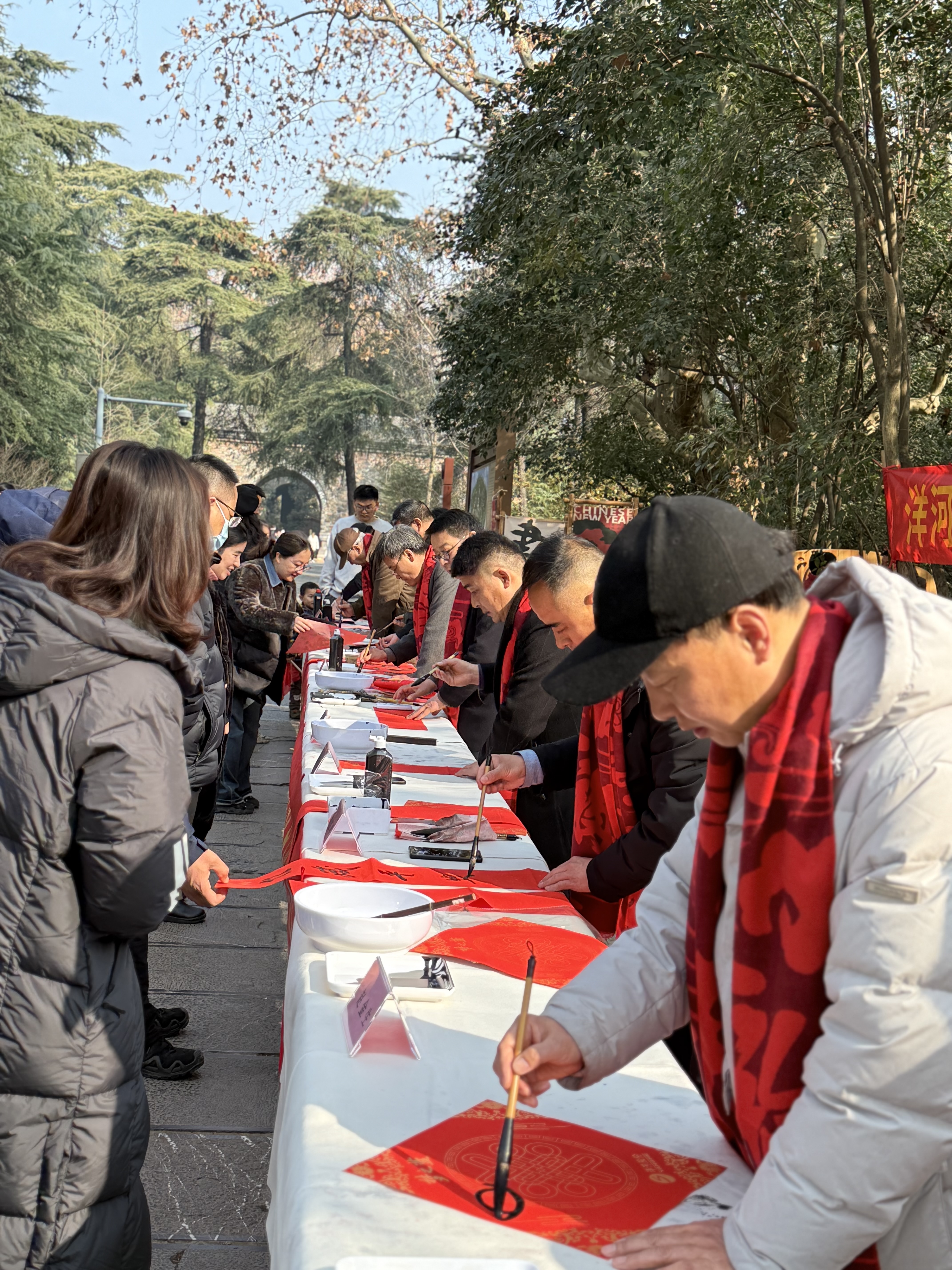 明孝陵博物馆党支部联合机关各支部,邀请江苏省美学学会书法专业委员会理事史居华、江苏省美术家协会会员王玉海、南京市书协副主席刘长平、江宁区书协主席丁楠、宿迁市书协副主席周泽波、中国美术家协会会员赵金生等书法名家齐聚一堂,挥毫泼墨,浓写春意,送出近200幅对联、1000个福字。一幅幅满载祝福的春联,一张张承载希望的福字,让市民游客近距离感受到了中华优秀传统文化的独特魅力。