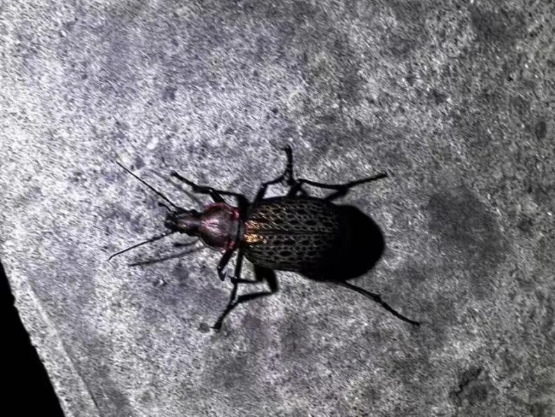 被称为“爬行的宝石”。鞘翅带有金属光泽,阳光下折射出蓝绿色或紫红色光芒,体长3—4厘米。它是凶猛的捕食者,专门捕食蜗牛、蛞蝓、毛毛虫,一天可捕食5—10只蜗牛,是农林益虫。受到惊吓时,会喷出有刺激性气味的液体(苯醌类物质)防御天敌。看到它,静静观察就好,不要用手去抓。