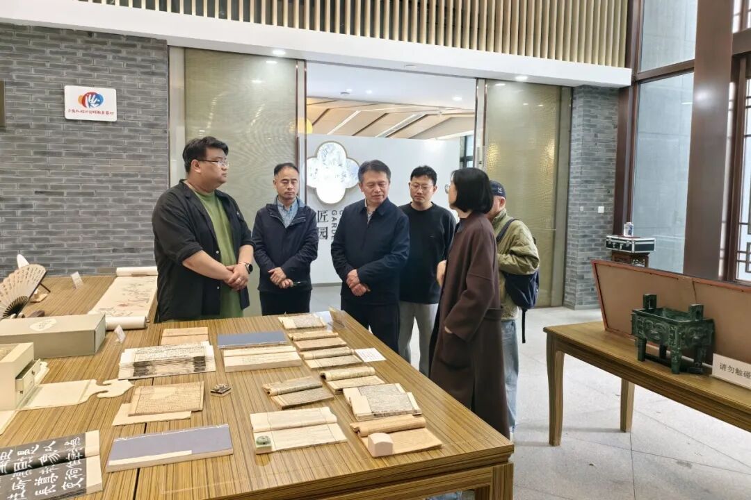 在莫愁中专副校长王燕等校方领导的热情接待下,双方参观了学校省级非物质文化体验中心匠园。匠园内展陈的雕版印刷、古籍装帧、织绣染等教学成果与学生作品,构建出一个充满文化感知的非遗空间。随后,一行人走进非遗创想中心与织绣染空间,近距离观摩云锦织造所用的大花楼织机及精美云锦作品,传统工艺与现代设计的融合令人赞叹。