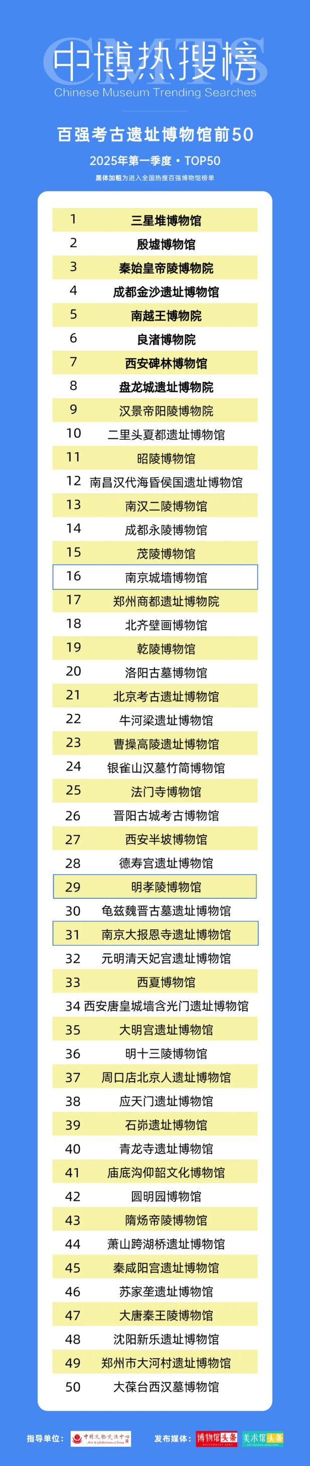 备受文博界关注的“中博热搜榜”,4月10日发布了2025年第一季度全国热门百强榜单及延伸子榜单。钟山风景名胜区明孝陵博物馆入选2025年第一季度“百强考古遗址博物馆前50”榜单,位居第29名。