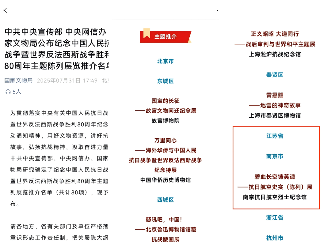 铭记历史,致敬英魂。日前,在中共中央宣传部、中央网信办、国家文物局联合公布的“纪念中国人民抗日战争暨世界反法西斯战争胜利80周年主题陈列展览推介名单”中,南京抗日航空烈士纪念馆《碧血长空铸英魂——抗日航空史实(陈列)展》光荣入选,成为纪念中国人民抗日战争暨世界反法西斯战争胜利80周年主题陈列展览推介项目之一,这是继今年3月入选江苏省革命文物类重点展览项目后,本展览获得的又一重要荣誉!
