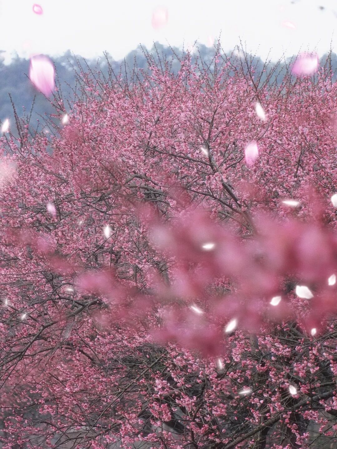 风一吹,落梅成雨,飘在肩头,落在掌心,那一刻才懂,什么是“春风十里,不如梅花山一场花吹雪”。