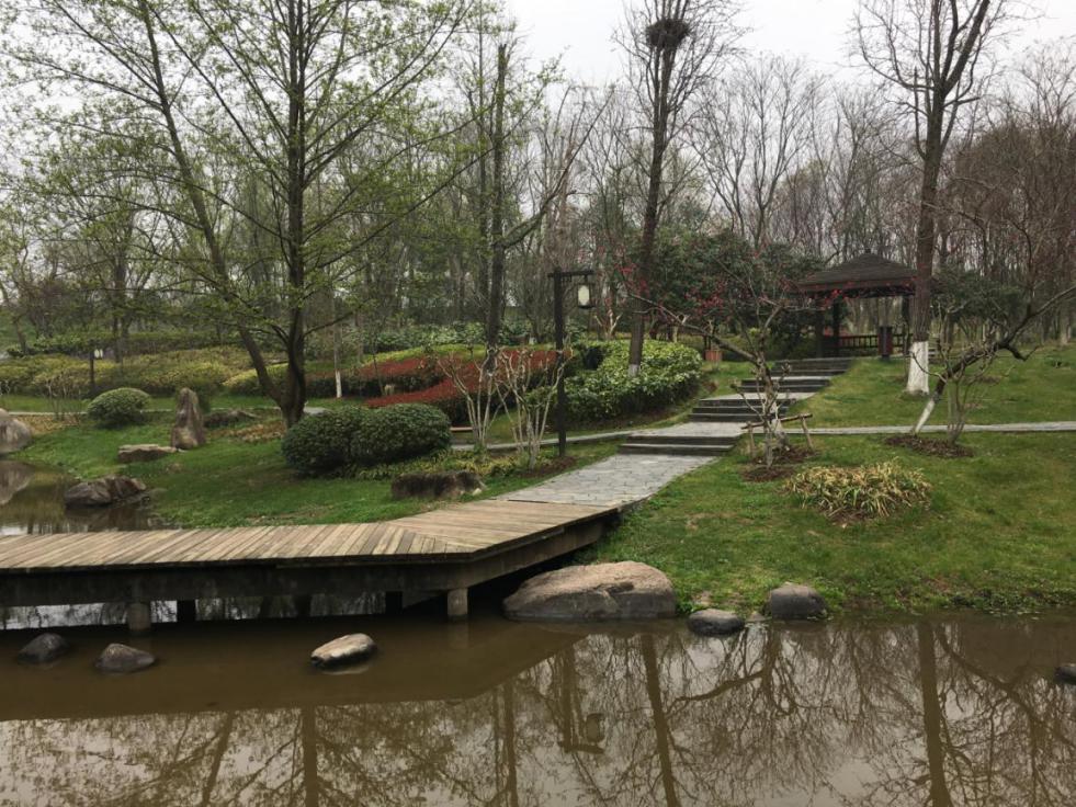 得益于近日较大的降水量,冬日里干涸的河床又充盈了起来。溪水潺潺,顺流而下,伴随着河道的宽窄变化,时而缓缓闲淌,轻拂岸边刚发芽的鸢尾和再力花,时而飞流直下,拍打着驳岸的石块击起白白的浪花。岸边挺拔的水杉林下开满了紫色的二月兰,弯曲的石板路上飘落了粉白的樱花,雅致的木亭前有含苞待放的桃花。